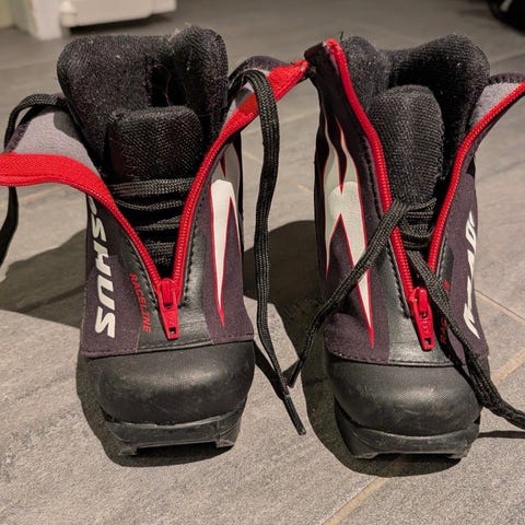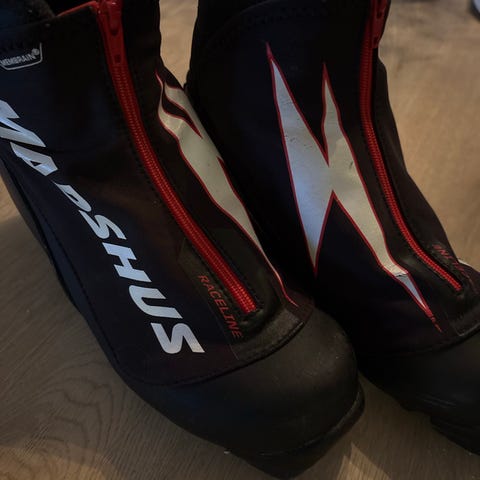 Madshus Raceline skisko for langrenn i størrelse 26. Modellen er laget for junior og har overdel i syntetisk materiale med glidelås i front. Skoene er i fargene svart og rød. Yttersålen er tilpasset Rottefella NNN-bindingssystem, egnet til klassisk langrenn for barn/junior.