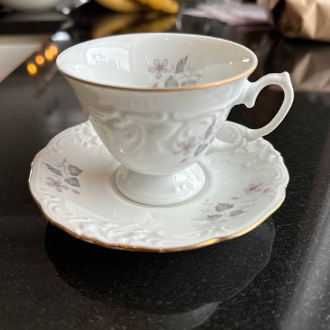 Kjempesøt, stor tekopp med skål (selges samlet) med påmalte roser. Fra Haideng of China. Helt uten hakk og skår. Kan hentes i Tønsberg, eller sendes for kjøpers regning.