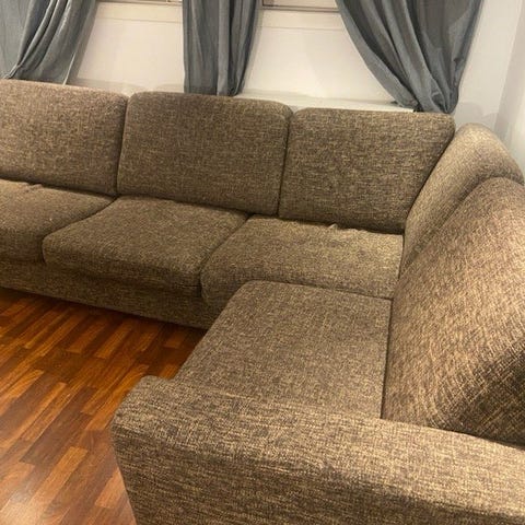 Sofaen har tidligere stått i en garasje og har noen flekker på seg.