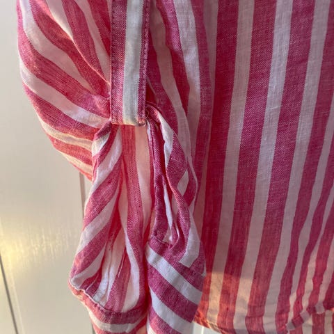 Hvit linbluse med trekvart ermer i str M. Skjerf som er avbildet kan selges ved interesse i tillegg. Mørk blått-Lys blått-lys rosa.
