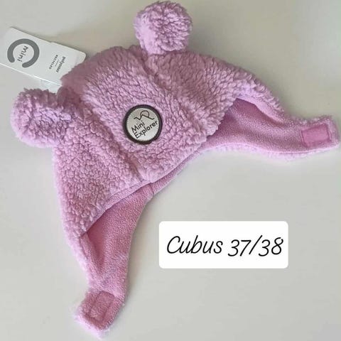 Cubus lue til jente i merinoull i størrelse 44. Lua er rosa og har øreklaffer med knytebånd og dusk på toppen. Passer til baby/jente 0-1 år