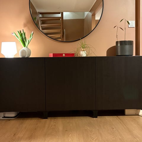 Jysk hvit og grå TV-benk med opphøyd plate. Understellet er hvit finish med oppbevaringsdel, mens topplaten er grå. Den opphøyde konstruksjonen gir ekstra hylleplass mellom topp og underdel, egnet TV-utstyr eller dekor. Selges da vi har kjøpt ny.