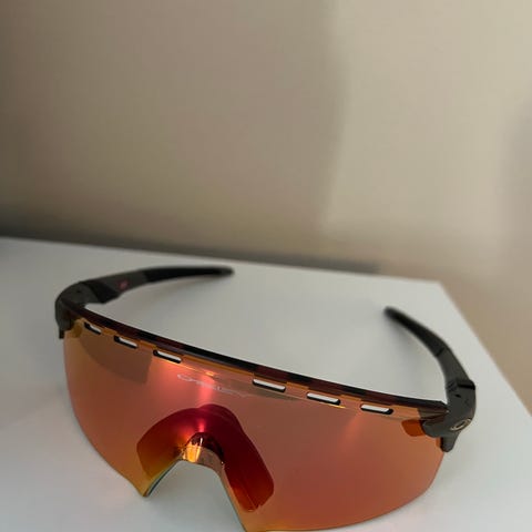 Oakley solbriller. Modellen har et heldekkende, buet glass som gir bredt synsfelt og god dekning rundt øynene. Innfatningen er i plast med Oakley-logo på stengene. Mørke glass som egner seg for bruk i sterkt lys. Passer til både menn og kvinner, og kan brukes til hverdag eller ulike sportsaktiviteter der man ønsker god øyebeskyttelse. Dessverre litt riper i glassene