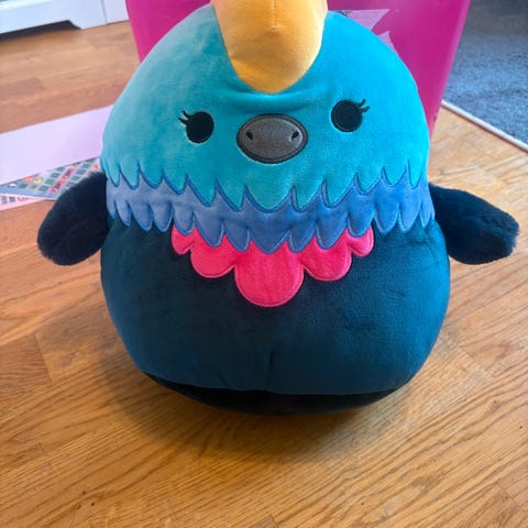 Squishmallows kosedyr i flerfarget design. Mykt plysjleketøy formet som en fugl med blå, gule, rosa og mørke detaljer. Egnet som kosebamse, pyntegjenstand på barnerom eller som pute. Laget i mykt stoff med fyll som gjør den behagelig å klemme på.