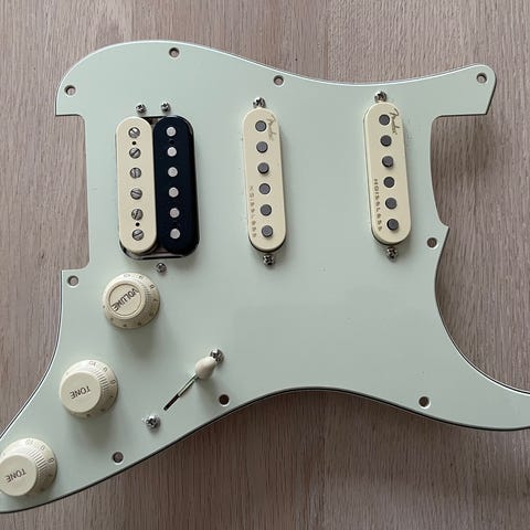 Komplett forhåndsloddet enhet med volum- og tonekontroller samt 5-veis bryter. Passer til elgitarer med Stratocaster-stil kropp og standard utsparinger for 2 singlecoil-pickups’ og 1 Humbucker. Svarte skruer følger med & Hals i lønn med rosentre gripebrett og perlemor-innlegg