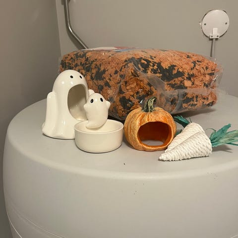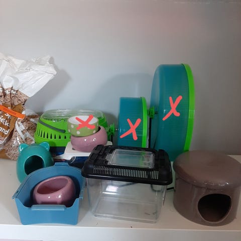 Hamster pakke grønn. Med ett stort løpehjul, en pose (20l) papirstrø, to hus fra bucatstate, og noe annet diverse grønt utstyr. Papirstrøet er i samme gate som carefresh og katee clean and cozy.