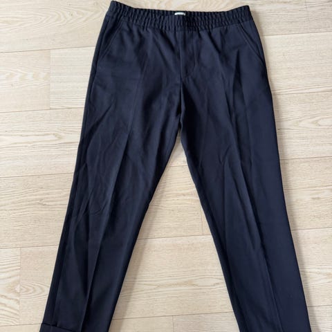 Filippa K bukse for herre i størrelse M. Buksen er mørke grå og laget i ull/polyester. Den har knytting i livet og rette ben med press. Passer til hverdagsbruk eller mer formelle anledninger, avhengig av bruk. Har brukt den en del, men den har blitt for liten for meg.