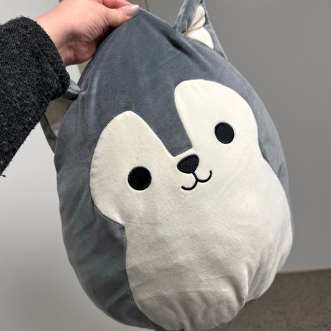 Squishmallows kosedyr formet som en hund. Kosedyret har grønn bakside og lys front med brune og hvite detaljer i ansiktet. Myk plysj med fyll som gjør det egnet som koseleke eller pyntepute. Passer for barn og andre som liker myke kosedyr.