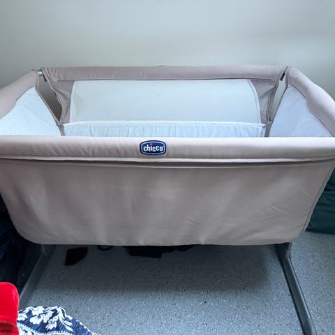 Chicco barneseng med justerbare ben og nettingpaneler for ventilasjon i grå farge.
