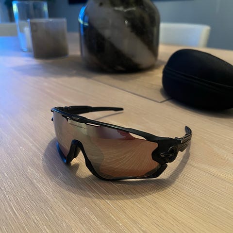 Oakley jawbreaker godt brukt, men mye liv igjen. Litt riper og små bruksmerker på glasset, men påvirker ikke synet. De har mistet gummien på stengene, men påvirker ikke bruken betydelig, kan også kjøpe nye av de.