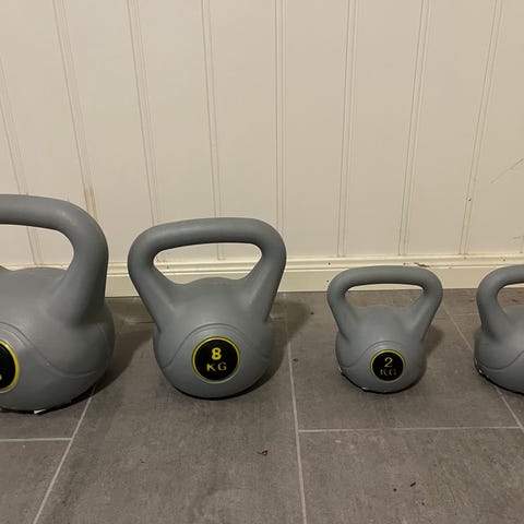 Kettlebells sett bestående av to vekter på 8 kg og 12 kg. Vektene er plastbelagte i svart med røde håndtak og rød markering av vekt i kilo. Egner seg til styrketrening, funksjonell trening og kondisjonstrening hjemme eller på treningsrom. Håndtakene er utformet for å gi godt grep ved ulike øvelser som sving, markløft og knebøy.