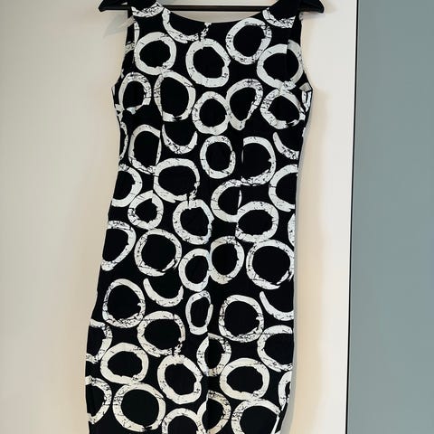 Sommerkjole for dame i størrelse S. Kjolen er hovedsakelig hvit med kontrastfarget mønster. Ermene er korte, og kjolen har knepping foran på overdelen. Passer til bruk på varme dager og kan brukes både til hverdags og enklere anledninger.