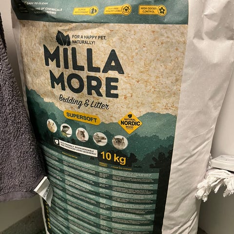 20 liter med bunnstrø, og ett lite trixie løpehjul.