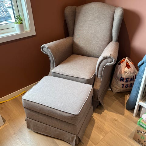 Selger Strandmon ørelappstol med fotskammel i farge beige. Er i god stand uten skader.