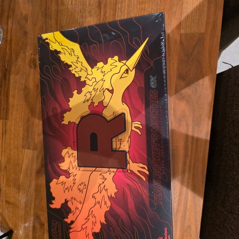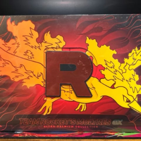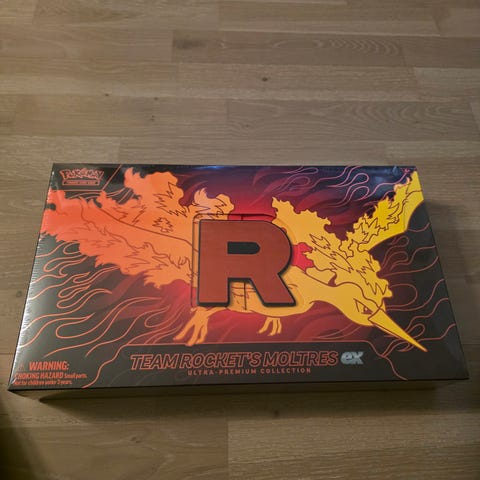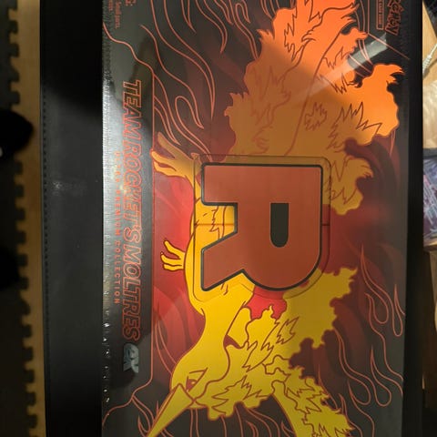 Pokémon Team Rocket’s Moltres EX Premium Collection samleboks. Esken inneholder samlekort og tilbehør relatert til Team Rocket og Moltres EX fra Pokémon TCG