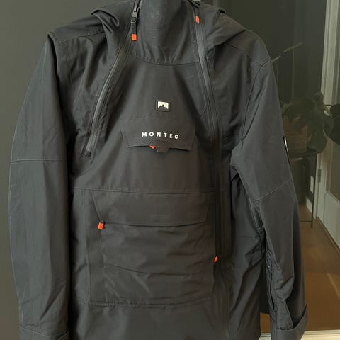 Pent brukt skijakke fra Montec, farge soft blue/black. Medium foret, vanntett og pustende. Hette med stormbeskyttelse, ventilasjon under armene, medielomme, snøskjørt, håndleddvarmere m.m