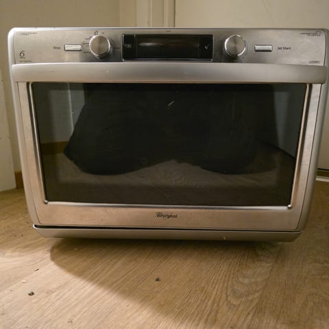 Frittstående modell med frontåpning og sidehengslet dør. Innsiden har roterende glassplate. Kontrollpanelet består av digitalt display, dreiehjul og knapper for blant annet effektinnstilling, grill, tining (Jet Defrost), crisp-funksjon, gratinering og ulike automatiske programmer (Jet Menu Crisp). Egen knapp for rask start (Jet Start) og stopp.