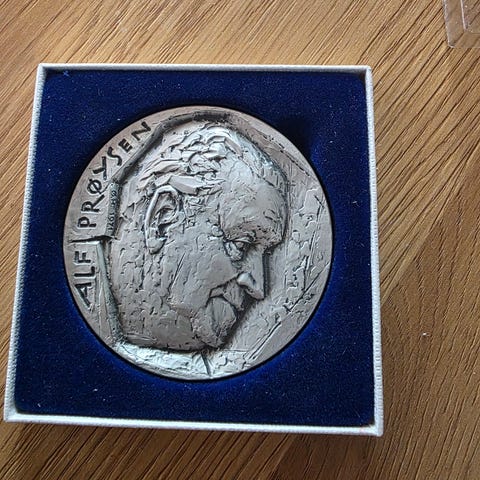 Selger en flott og velbevart minnemedalje av Alf Prøysen, utgitt av Den Kongelige Mynt på Kongsberg i 1973. Dette er den sjeldne utgaven i sterlingsølv, ikke den vanlige bronseversjonen.