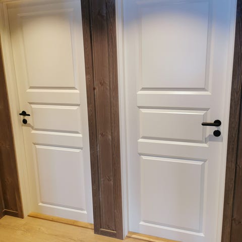 Innerdør med profilert design i hvit farge. Døren har klassiske speil og er beregnet for innendørs bruk. Egnet som romdør i bolig, for eksempel til soverom, bad eller oppholdsrom. På bildene vises detalj av dørblad med to små hull i et av speilfeltene.