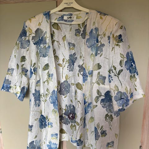 Blusen er flerfarget med blomsterprint i duse toner. Materialet er lett og gjennomsiktig polyester. Modellen har knapper foran og vide ermer med lett utsving. Passer godt over topp eller singlet, og kan brukes både til hverdags og mer pyntede anledninger.