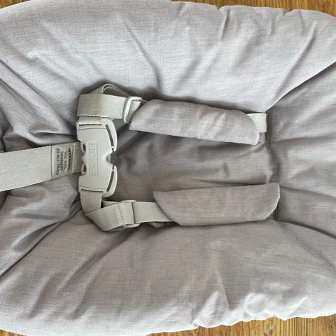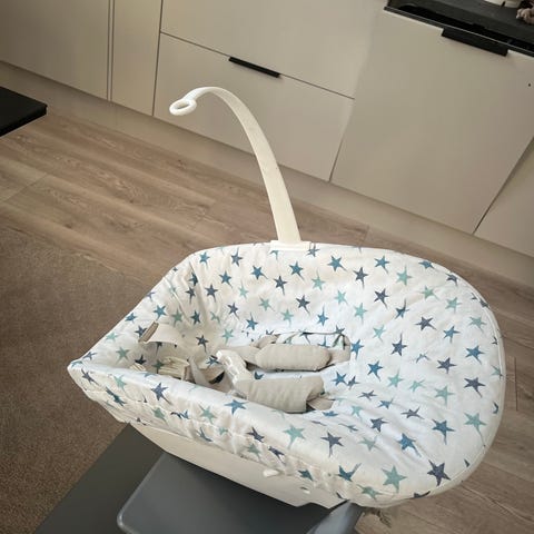 Stokke barnestol sete med integrert sele. Setet har rosa trekk med mønster og flere festepunkter på undersiden for montering på kompatibel Stokke-stol. Utstyrt med justerbare stropper og spenner for å sikre barnet i stolen. Passer som ekstra eller utskiftbart sete til Stokke barnestol, egnet for små barn som trenger støtte og sikring ved bordet.