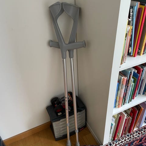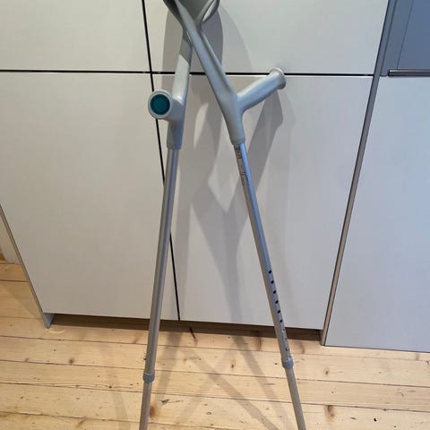 Herdegen krykker i justerbar lengde. Krykkene har håndtak og underarmsstøtte i svart plast og rør i aluminium. Gummiføtter nederst gir stabilitet mot underlaget. Egnet som ganghjelpemiddel for voksne som trenger ekstra støtte ved forflytning.