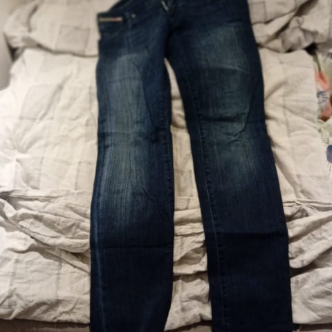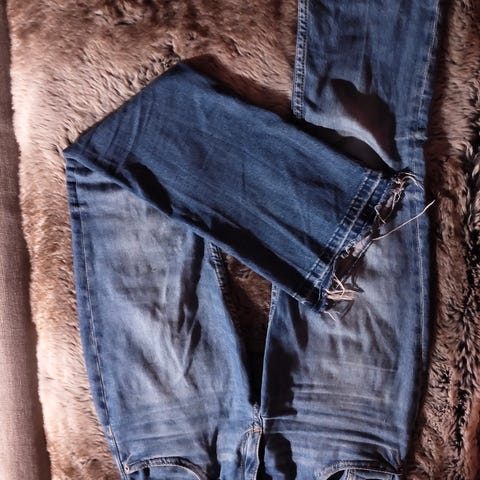 Steinvaska jeans fra merket Meltin`Pot. Dette er en Skinny Fit modell, størrelse W28 / L34. Litt småslitt her og der, men ingen hull. Buksa har knapper, ikke glidelås.