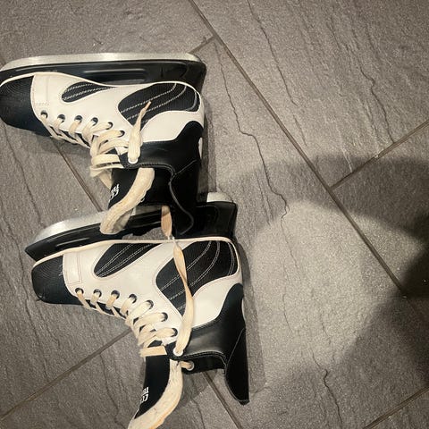 Ishockeyskøyter i størrelse 42 i svart og sølv med gule detaljer. Overdelen har snøring for justering av passform og støtte rundt ankel. Skøytene har metallskinne festet til sort underdel. Egnet til ishockey og generell bruk på isbane for voksne eller større ungdommer som trenger skøyter i størrelse 42.