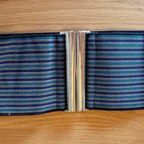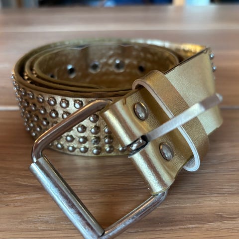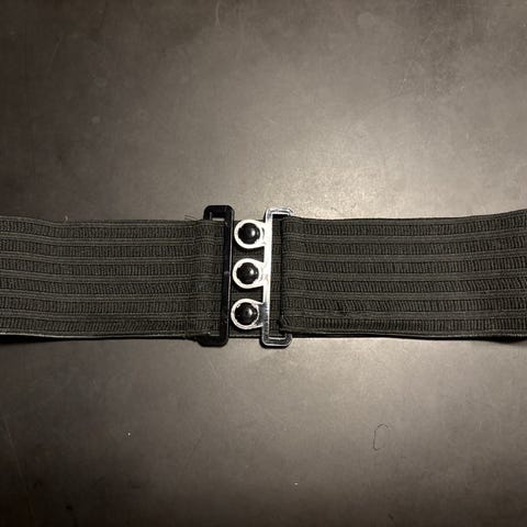 Damebelte i elastisk materiale med brede endestykker i imitert skinn. Beltet er svart og har en dekorativ metallspenne i sølvfarge med utskårne detaljer. Spennen lukkes foran, og beltet festes med trykknapper på baksiden av endestykket. Passer til bruk i livet over kjoler, tunikaer eller gensere for å markere midjen.