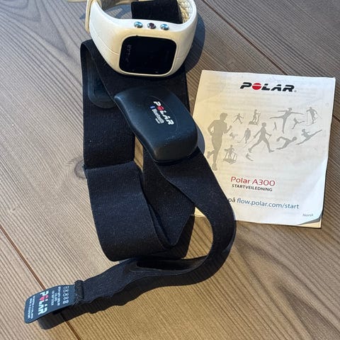 Polar A300 pulsklokke med hvit reim, trådløs (Bluetooth) pulssensor med bryststropp, USB-kontakt for lader. Egner seg til løping, sykling, ski og annen utholdenhetstrening der man ønsker registrering av puls og treningsdata.
