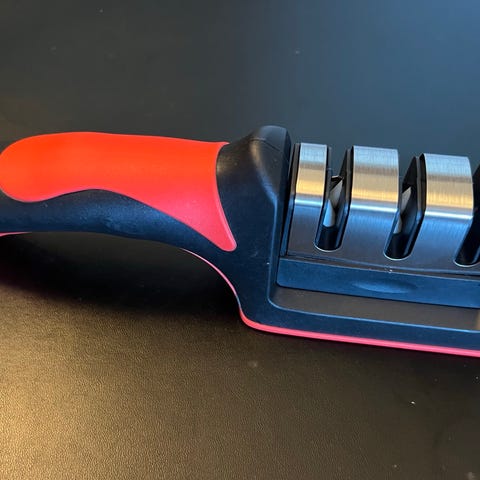 - Knivsliperen passer både europeiske og japanske kniver og er utstyrt med et stabilt håndtak i plast, innfelt med rustfritt stål for ekstra holdbarhet og komfort.