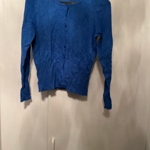 H&M Basic cardigan for dame i størrelse M. Cardiganen er blå og laget av bomull. Den har rund hals, lange ermer og knepping foran med knapper. Ribbestrikkede kanter ved ermer og nederkant. Passer som et enkelt lag over topper, skjorter eller kjoler i hverdagen eller på jobb.