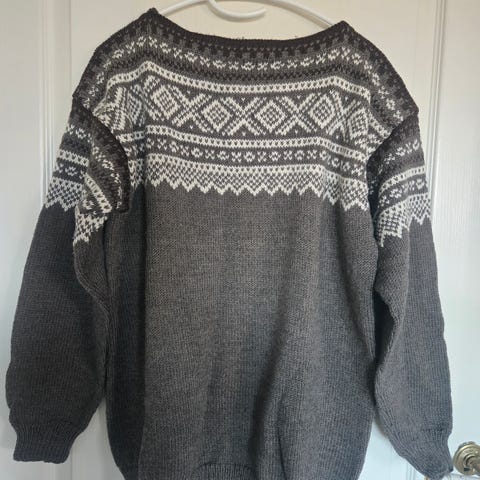 Selger en ull hjemme strikkede genseren da den ikke blir brukt. Mannen på bildet er 182 cm høy og veier 85 kg