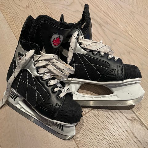 Canada 730 skøyter for ishockey i størrelse 41. Modellen har svart overdel med lyse detaljer og snøring foran. Skøytene har polstret ankelparti og hælkappe med «Canada 730»-merking. Egnet til bruk på isbaner for ishockey eller generell skøytebruk.