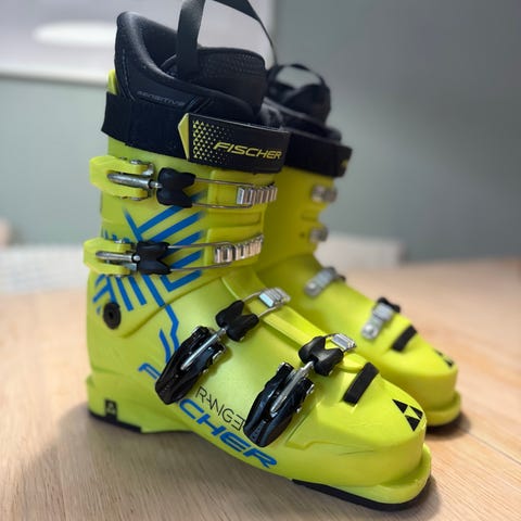 Salomon Ghost FS 90 alpinstøvler i størrelse 26.0. Støvlene har grønn underdel og svart skaft med røde spenner og oransje detaljer. Modellen har fire spenner og powerstrap øverst for bedre tilpasning rundt leggen. Passer til alpint bruk i vanlige alpinbindinger. Egner seg for brukere som trenger en støvel med fleks på 90-nivå (FS 90).