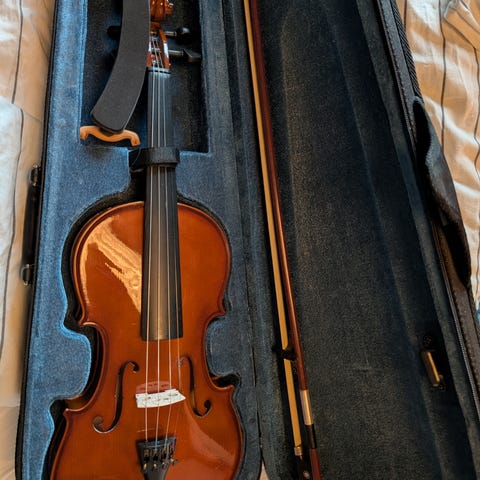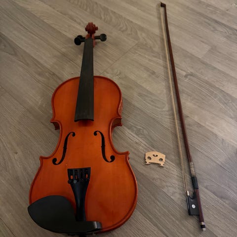 Fiolin størrelse 1/2 (ca 51cm) fra Dirdals fioliner med naturfarget lakkert overflate. Usikkert hvilket år den er lagd, men antar i begynnelsen av 2010-tallet. Fiolinen selges med bue og hard koffert med lomme på toppen. Standard gripebrett, stemmeskruer og hakebrett. Passer for barn 6-10 år.