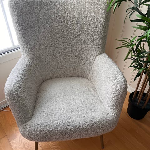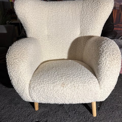 Selger en pent brukt lenestol i teddystoff, kjøpt i 2023. Ingen merker eller flekker, trekket kan tas av og vaskes. Legger ved bilder med spesifiksjoner fra Jysk. Opprinnelig pris: 2299kr