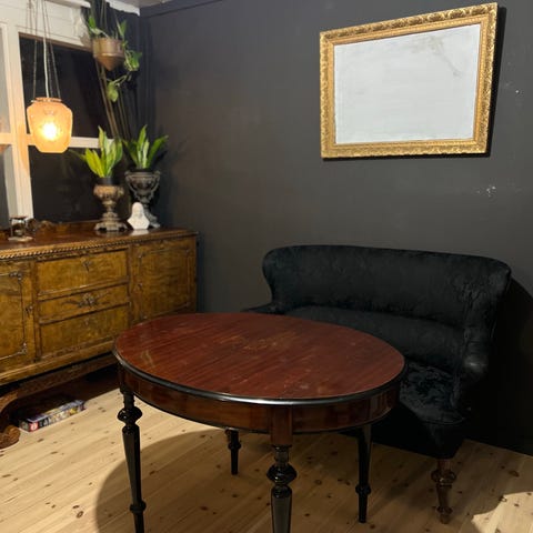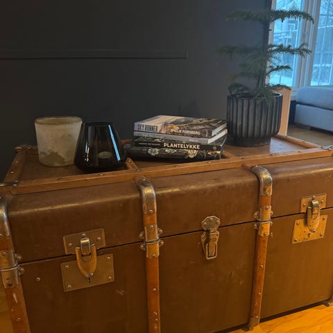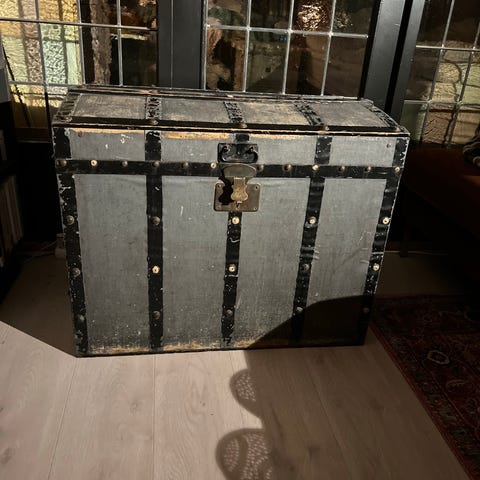Vintage koffertkiste i svart metall med detaljer i tre og lær. Kisten har originale håndtak og gamle reiselapper, blant annet med tekst som viser rute til Bergen og Amerika. Har brukt dette som sofabord i mange år. Glassplate følger med. Rustikt og koselig.
