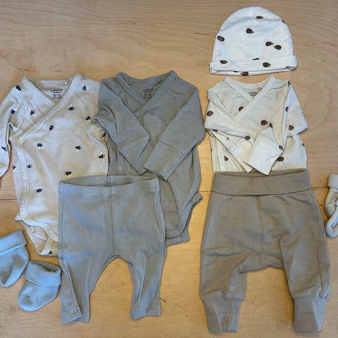 Newbie klespakke med 3 stk omslagsbody og 2 stk bukser/joggebukser/kosebukser str 62. Alt er fra 2025, og mesteparten er lite brukt da lillebror vokste rett ut av størrelsen. Kjempe fine plagg i nøytrale farger. Alt er vasket med parfymefritt vaskemiddel. Dyr-og røykfritt hjem. Selges til under halvpris. Alle plaggene selges fortsatt i butikk.