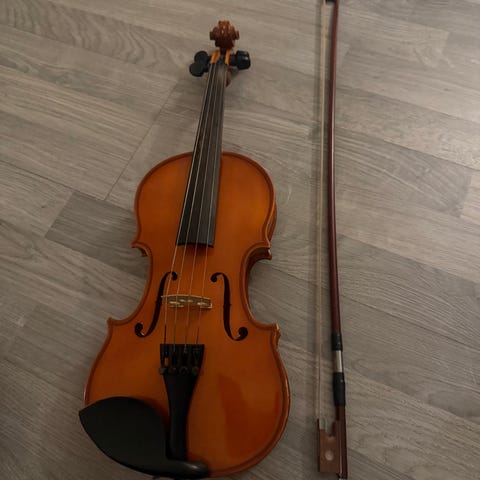 Trenger nye strenger (stolen settes på ved nye strenger). Bue trenger å få byttet stålgrå og bytte hårene (vanlig vedlikehold).