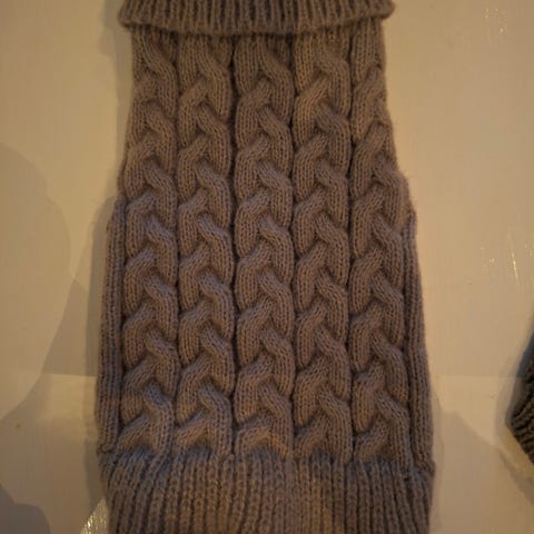 Strikket hundegenser i beige farge. Genseren har flettestrikket mønster og ribbestrikkede kanter ved hals og nederkant. Det er to runde åpninger til forbeina. Materialet ser ut som mykt, elastisk strikk som gir god bevegelighet for hunden. Egnet for mindre til mellomstore hunder, avhengig av mål. Målebånd på bildene viser omtrentlige mål for lengde og bredde, slik at passformen kan vurderes opp mot hundens størrelse.