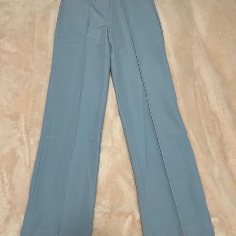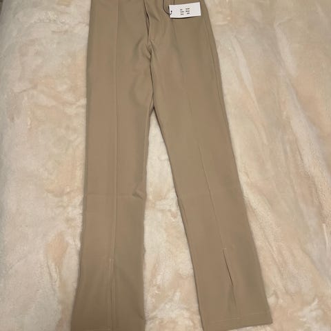 Design by Si bukse for dame i størrelse XXS. Buksen er brun. Modellen har rette ben med svak utsving nederst og press i front, egnet til hverdagsbruk eller mer formelle anledninger avhengig av styling. Ifølge kundeservice skulle buksen være slik med utseende av misfarget, dette likte jeg ikke selv, derfor selger jeg de. Passform og alt var helt nydelig.