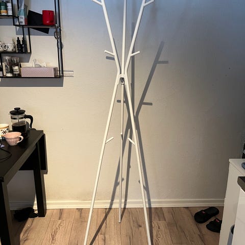 Stilren og praktisk gulvstående knaggrekke i hvit utførelse selges for 250 kr. Perfekt til gang, entré, soverom eller kontor.