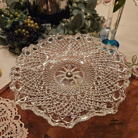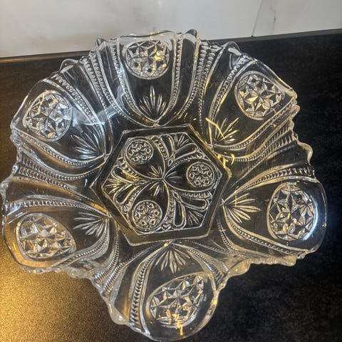 Glassbolle med dekorativt slipemønster og gulfargede blomsterdetaljer. Bollen står på små glassføtter og har bølget kant øverst. Egner seg til servering av frukt, snacks eller som pyntegjenstand på bord eller skjenk.