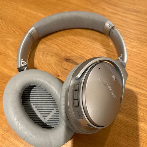 Bose QuietComfort hodetelefoner i sølvfarge. Over-ear-modell med polstrede øreputer og bøyle. Trådløs og kablet bruk kan være støttet avhengig av spesifikk QuietComfort-versjon. Egnet til lytting til musikk, film og annet lydinnhold hjemme eller på reise. Øreputene og bøylen har synlig slitasje, se bilder for tilstand.
