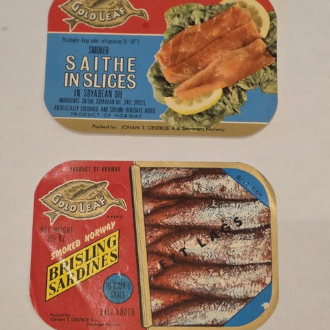 - Ergo Brisling: Pakket av Stavanger Packing Co. A/S. Motiv av brisling i olje med en kokk i bakgrunnen.
