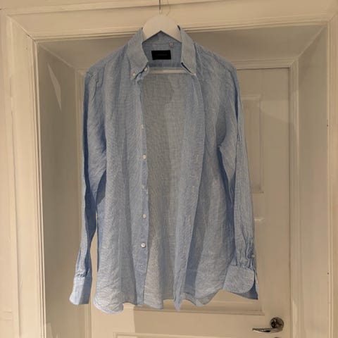 Meget pent brukt skjorte i lys blå stripet poplin.