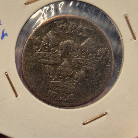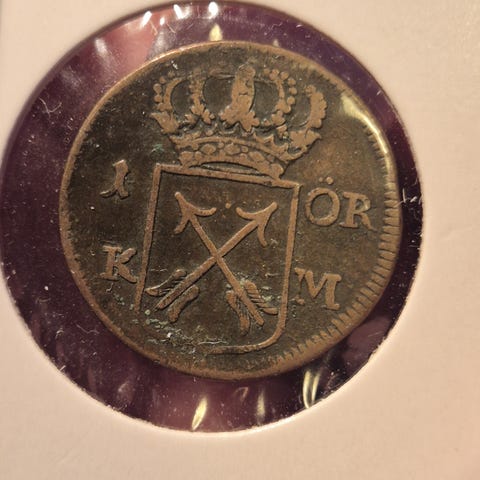 Svensk 1 öre kobbermynt datert 1749. Forsiden viser to kryssede piler under krone med påskriften "1 ÖR S M" og årstallet 1749. Baksiden har monogram med krone over og to mindre kroner på sidene. Mynten er preget i kobber og har tydelig årstall og motiv. Egner seg som samlerobjekt innen nordisk mynthistorie fra 1700-tallet.