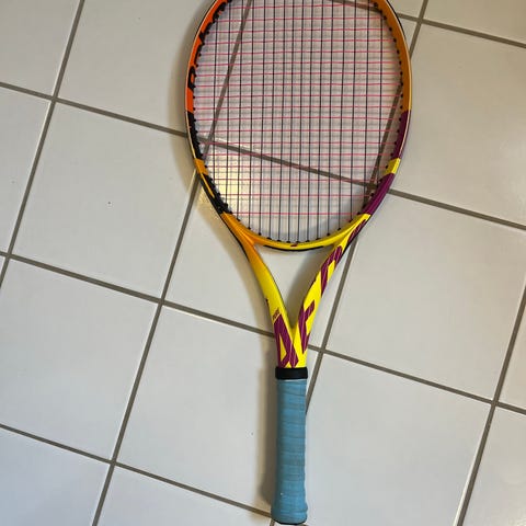 Selger en lite og pent brukt Babolat Pure Aero Rafa 100 grep 3. Strenget med Babolat RPM Blast Rough.