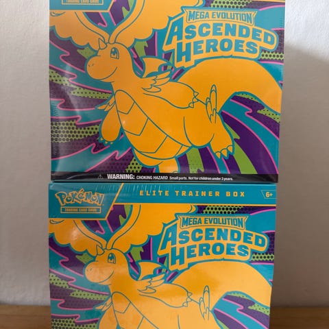 Pokémon Mega Evolution Ascended Heroes Elite Trainer Box samleboks. Inneholder tilbehør til Pokémon Trading Card Game, typisk kortboostere, kortbeskyttere, terninger og annet spillutstyr tilpasset serien Ascended Heroes. Egnet for samlere og spillere av Pokémon-kort.